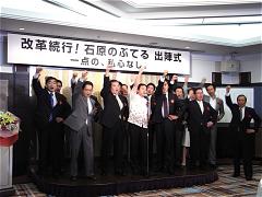 午前中の神事に引き続き、石原のぶてる候補の出陣式に出席。
