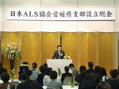 第39番目の支部として日本ALS協会愛媛県支部を立ち上げる設立総会が開かれる。入院中の病院長の許可が漸く下り、何とかストレッチャーで出席できた中谷祐子支部長さんの力強い冒頭挨拶、宣言文朗読や、既に人工呼吸器を装着されながらはるばる東京から来られた全国の大橋会長のボランティア通訳を通じた約一時間に及ぶ記念講演などに、心を揺さぶられる。私も国会議員として、原因解明、治療法確立などに向け、精一杯の努力をする決意を新たにする。