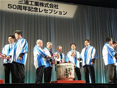記念式典に引き続き、白石省三会長、三浦工業のイメージキャラクターである島田紳助さんらとともに鏡割りを行う。