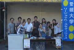 萱町商店街で天神祭り夜市が開催される。愛媛大学法文学部の地域(リージョナル・スタディ)特別コースの学生たちもまちづくりの研究でお店を出していて、地域を超えた商店街の盛り上がりを見る。