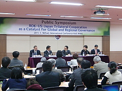「第5回北東アジア3か国対話」終了後、同じ韓国外交安保研究院にて米国国防総省のデレック・ミッチェル筆頭次官補代理、韓国議会のチュン・オクイム議員、北岡伸一東大教授と私がパネルディスカッション。新しい日米韓3か国協力のかたちと広範な中身についてそれぞれの考えを述べ合う。