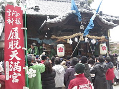 久保田町にある履脱天満宮の天神祭におじゃまする。学問の神様として知られる菅原道真が、九州の太宰府に流された際に、履物を脱いで休んだため、このような名がついたそうだ。神事の後、皆さまに福が届くよう願いを込めて餅撒きに参加させて頂いた。