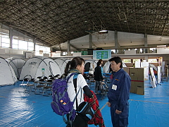 震災直後から気仙沼で救援活動を展開してきたNGOのピースウィンズ・ジャパンのメンバーから聞く。ここ気仙沼中学校の避難所に常駐しながら、心のケアにも注力中で、最近はご覧のように、家族か職場単位でテントに入って生活することで環境は多少改善。