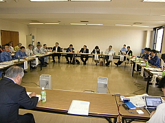 県庁隣の福島県自治会館にある、政府の前線基地、政府現地連絡対策室の活動ぶりについて説明聴取の後、意見交換。