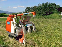 いよいよ稲刈り。操作方法を確認しながら慎重に進める。今年は雑草やイノシシに倒された影響で収穫量が少なそうだ。