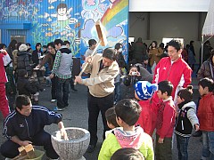 体操スクールで開催される、毎年恒例の餅つき大会に今年も参加。青空の下、スクールの子どもたちと一緒に餅つきをしました。