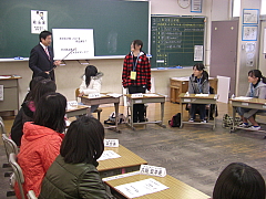 授業の後半は、総理大臣や官房長官、担当大臣や野党党首などの与野党の役割分担を行いテーマ別に模擬予算委員会を実施しました。「脱原発」では同じ事故を繰り返さないような仕組みができないと原発は危ないといった意見や「消費税の増税」については社会保障費が増えるので仕方がないといった意見や、無駄を省くことからやらないと増税反対といった議論が繰り広げられました。