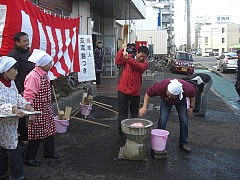 地域の紅白餅つきに参加する。翌日の成人式のために、地元の中学生など地域全体でお祝いをしている姿に強い繋がりを感じました。私もお祝いの気持ちを込めて、ひとつきさせていただきました。
