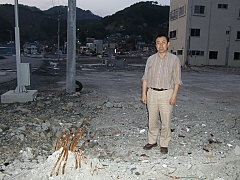 殆ど火の消えたままの夕暮れの釜石港の街並み。ねじ曲がった鉄筋に、津波の強さと流れの方向が読み取れる。