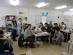 昨年4月もお世話になった国際NGOのJEN石巻事務所を訪問。30名のスタッフのうち、本部からは3名のみで、現地スタッフの多くは被災者。現在はコミュニティー再生を中心に活動、最終目標は「心の復興」とのこと。