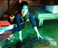 先ほどの写真の右後方にも見えますが、店内にはウミガメが2匹います。飼育員が必要で、許可もとっているとのこと。