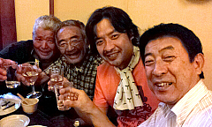 木村式自然栽培(無農薬、無化学肥料、無除草剤)のコメを作る松山市・荏原の田んぼでの田植えと、その後の荏原公民館でのパネルディスカッションを終え、自然栽培米から造った日本酒で乾杯!左から、岡山で自然栽培でコメを作り、今日の苗を持ってきてくれた山田さん、「奇跡のリンゴ」の木村秋則さん、障害者の自然栽培農業を進める、今日のイベント主催者、松山のNPO法人ユニバーサルクリエート佐伯代表と。