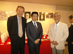 新潟で初めて開く砥部焼新潟展の内覧会にて。「淡黄磁」を究める永立寺窯西岡秀典窯元(右)、砥部町の文化会館顧問も務める元愛媛新聞事業局長烏谷照雄実行委員(左)と。