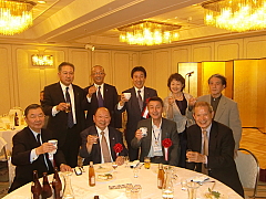 砥部焼新潟展の開会式後、砥部と新潟のお酒で乾杯。前列左から新潟総合テレビ・大橋社長、中村砥部町長、篠田新潟市長などの皆さんと。