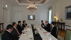 フドルフ・ヘンケ連邦議会保健委員会副委員長(右側中央)と約2時間にわたり、日独の医療・介護改革を語り合う。いずれも少子高齢化が進む中、地域での暮らしを一層重視しながら保険者機能を高め、保健・健康づくり政策、予防、重症化予防などにより重点を置く方向性について確認。
