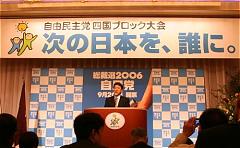 9月8日告示、20日開票の自民党総裁選挙に向け、武部幹事長の提案により、全国10ブロックにおいて、総裁選出馬予定者を招いて政権構想などを聞くブロック大会を開催することとなる。安倍官房長官出馬表明の翌日である2日は、愛媛県連会長の私が実行委員長となり、松山において四国ブロック大会を開催、候補者3人が揃い踏み。公共施設が使えず、ホテル会場ではモニターTVも設置し何カ所かに分かれての盛況の中、クロストークもあって盛り上がる。冒頭、実行委員長として挨拶。