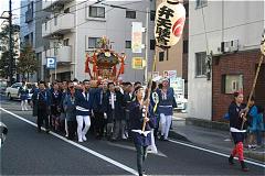 さわやかな秋空の下、私もコアメンバーの一員である弁天睦會の仲間と一緒に、力強く神輿をかきながら松山の町を練り歩く。