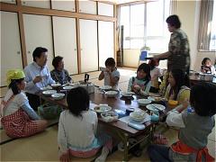 地域の皆さんの協力により公民館の調理室を利用して開催している、「子供クッキング教室」に飛び入り参加。今日のメニューはシャケおにぎり、わかめおにぎり、菜めしおにぎりとトマトスープにドーナツ。みんな上手に料理できてます。子供たちの「おじちゃん、わたしのも食べてぇ〜」攻撃に、もう満腹です。