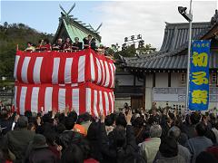 道後温泉の守護神である大国主命と小彦名命の二神をまつる「湯神社」で『初子祭』(はつねさい)が開催される。大国主命がねずみによって火難から救われたという故事に基づくもので、市民に親しまれる祭りで境内では大勢の方で賑やか。古いお札や飾りを焼く「神札焼上祭」や火防せを祈願しての撒餅も行われる。うまくキャッチして!