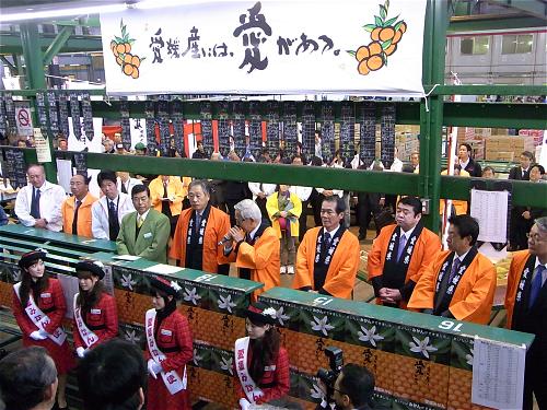 早朝から大田市場の競売場で平成21年度愛媛みかん東京トップセールスと題した愛媛みかんPR活動に加戸知事はじめ多くの関係者と共に参加。県内各地の選りすぐりみかんを試食させていただき、全国の消費者にこのとっても美味しい愛媛のみかんをもっと食べてもらいたいと実感。