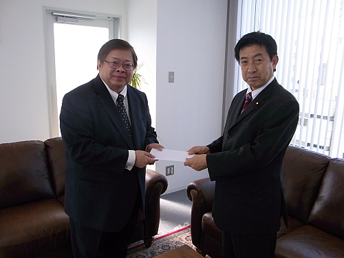 先日開催した日本・タイ友好議員連盟緊急会議の中で、議連として義援金を贈呈するはこびとなり、本日タイ大使館にてウィーラサック大使に直接贈呈する。一日も早い復興を祈りたい。