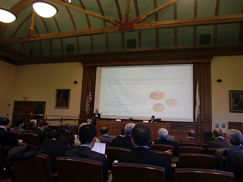 ハーバード・ロースクール、エイムズ・コートルームでの日米金融シンポジウム全体会議。政府債務、金融規制、デフレ・インフレの3議題を、真の世界経済発展のために如何にあるべきか議論。前2議題については、分科会も開催。