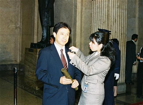 当選証書と引き換えに衆議院職員に議員バッチをつけてもらう。山積する諸問題に衆議院議員としての自覚を新たにする。