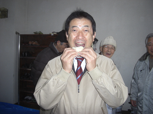 八坂地区3世代交流餅つき大会に参加。子どもからお年寄りまで地域の皆さんと一緒にお餅をつき、おいしく頂きました。みかんが丸ごと入った、愛媛ならではのみかん餅、お勧めです!