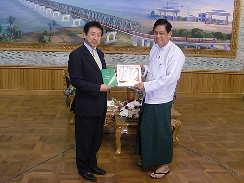 議連の面々とともに与党USDPのテー・ウー総書記と会談後、お互いにお土産の交換。