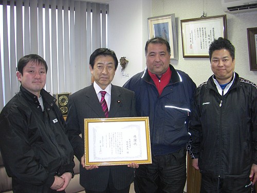 昨年12月に石井小学校「おやじの会」主催により開催された、子ども達のための職業体験イベント「きっずニア石井2011」で私が「政治家ブース」の講師を担当した事への感謝状を頂く。きっずニア終了後のアンケートでは政治家を目指したいという子どもたちがいたと聞き、私も目標とされる政治家になるべく頑張りたいと思います。