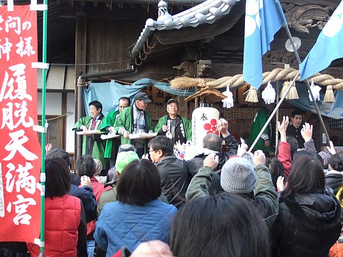 市内西部にある履脱天満宮の天神祭におじゃまする。神事の後、地元中学生と一緒に餅まきに参加する。
