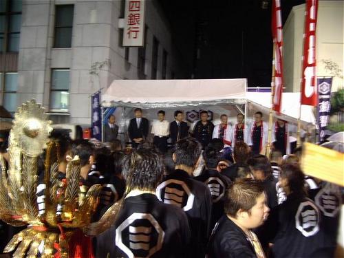 最近漸く全国TVネットで取り上げられ始めた、全国でも珍しい「喧嘩神輿」の14体が、松山の目抜き通り(千舟町通り)に初めて全て結集。「総練り担き比べ」を前に私も挨拶。あいにくの雨も、何のその!神輿の上の鳳凰が一段と輝く。
