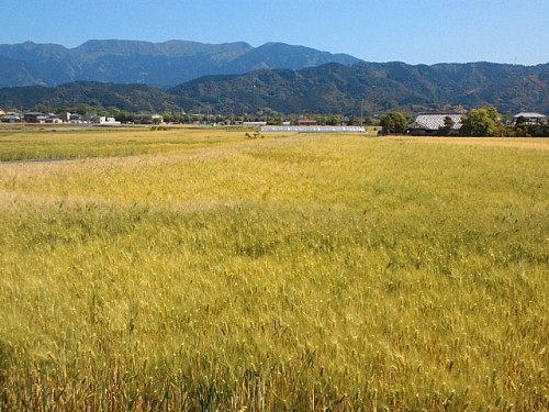 今年も生産日本一になる見込みの愛媛県のはだか麦の収穫も間近。一面黄金色の麦畑が広がる東温市田窪近辺。