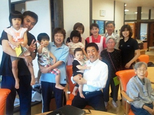 手前が高齢者のデイサービス、奥が子ども達の託児所。職員の皆さんを含め、皆とけ込んで、心は豊か。
