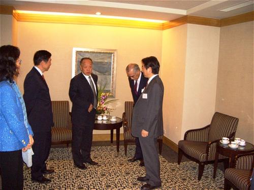 三極委員会でのスピーチのために訪れた中国外交部の李肇星部長(外相)と、控え室にて歓談。