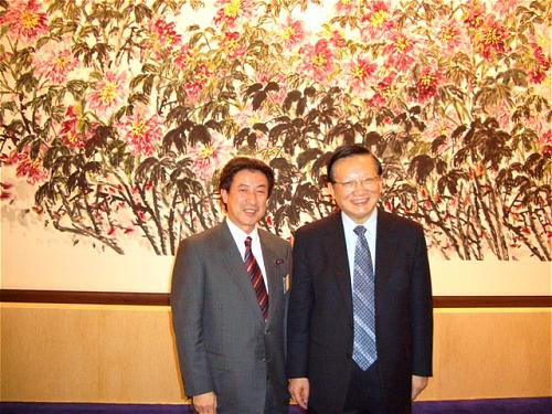三極委員会メンバーを招いた釣魚台迎賓館での夕食会のホスト、唐家セン国務委員と並ぶ。