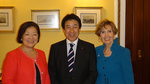 日本研究グループの事務局、議員経験者協会会長などを務るコニー・モレラ元連邦下院議員(向かって右側、共和党)と、メイジー・ヒロノ連邦上院議員(向かって左側、民主党、ハワイ州)と議会内で意見交換。