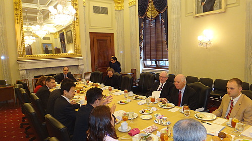 今季限りで引退予定のロックフェラー上院議員(民主党、ウェストバージニア州、5期)、ベン・カーディン上院議員(民主党、メリーランド州、2期)らと上院内会議室で昼食懇談。優秀な政策スタッフがいるおかげで、様々な立法措置ができ、いかなる政策課題にも意見が持てるようになっている、と感慨深げ。この仕組みこそが、アメリカ民主主義を支えていると思うが、日本ではどうなっているか、といった会話が続く。