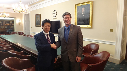 TPP慎重派が大勢の民主党にあって、親ビジネス・自由貿易を推進する「新民主連合」の議長を務め、超党派のTPP推進議連「TPPコーカス」の共同議長も務めるロン・カインド連邦下院議員(民主党、ウィスコンシン州、9期)を、所属する歳入委員会・保険小委のヒアリングが行われている委員会室の隣の会議室にヒアリング途中で抜け出してきてくれ、面談。日本におけるTPP論議に関し、次々に鋭い質問が飛んでくる。