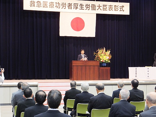 「救急の日」の本日、長年にわたり地域の救急医療の確保や救急医療対策の推進に貢献された、医療機関や個人を表彰する救急医療功労者厚生労働大臣表彰式が開催された。 祝辞を述べるとともに功労者へ表彰状をお渡しする。