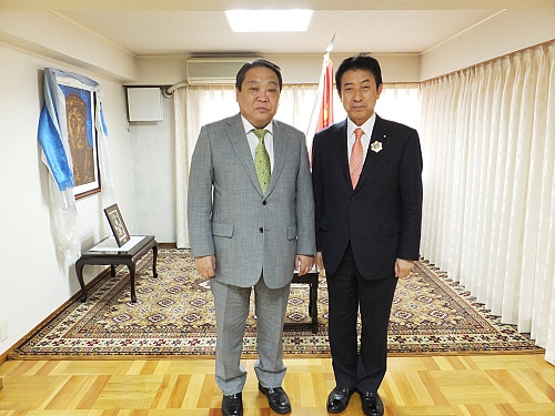 日本とモンゴルの関係強化に多大な貢献をしたとして、モンゴル国政府より外国人に贈られる最高勲章「北極星勲章(アルタン・ガダス)」の受章の栄誉にあずかる。フレルバータル駐日モンゴル国大使ご自身に勲章をつけて頂き、記念撮影。個人的な信頼関係を更に深め、両国間の様々な分野における交流促進を約束。