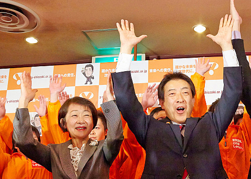開票報告会場にて、20:00過ぎにマスコミ各社より早々に当確を出していただき、駆け付けて下さった皆様と当選の喜びを分かち合う。