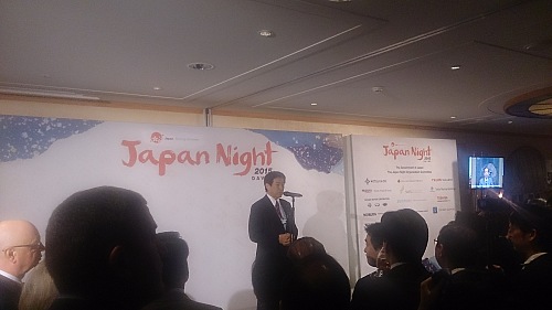 世界経済フォーラム(ダボス会議)のジャパン・ナイトにて歓迎の挨拶。今年の参加者数は、アベノミクスへの期待をベースに、世界文化遺産に指定された「和食」や日本酒・焼酎などを愛好する日本ファンも殺到し、過去最高で、熱気ムンムン。