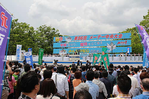 第86回メーデー中央大会が、東京・代々木公園で開催され、政府代表として挨拶を行う。安倍内閣が企業の賃上げや女性の活躍、多様な働き方の実現等を目指す中、特に夏期には朝型勤務を広げ、できるだけ早く帰社して家族と過ごす時間や自己研鑽に当てるなど、働きやすく、豊かな生活を送れる社会を目指していくことをお誓い申し上げる。