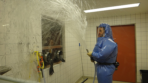 エボラ出血熱、サーズの蔓延などに備えた最大20床を確保可能な重症感染症隔離病棟で使う使い捨て防護服を脱する前の消毒作業中の男性看護師。フィルター付きモーターによって空気を注入する装置つきの完全防護服。この後、消毒液の泡で全身真っ白になる。わが国の備えも、更なる促進が必要だ。