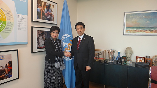 1月のダボス会議以来の会談の為、WHO本部に、WHO総会を一週間後に控えるマーガレット・チャン事務局長を訪ねる。WHO改革と予算等、グローバルヘルスの新たなガバナンス体制、日本の貢献の在り方、等々、じっくり話し合う。