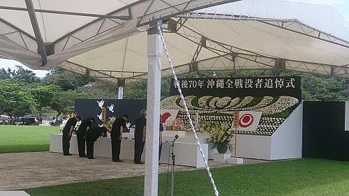 太平洋戦争末期の沖縄戦で最後の激戦地となった糸満市にある平和祈念公園にて「戦後70年沖縄全戦没者追悼式」が開催され、安倍総理や関係閣僚とともに出席し、哀悼の誠を捧げる。犠牲となった方々へ思いを馳せ、平和への祈りを新たにする。
