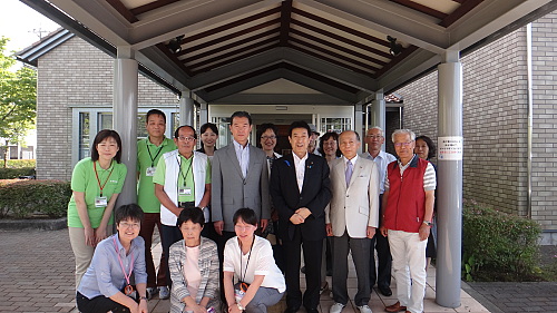 意見交換会の後に市民センターの前で、亀井名張市長(私の向かって左)、「まちの保健室」、センターなどの明るく前向きなスタッフ、医師会長、住民交流サロンきずなのボランティアの皆さんなどと記念撮影。