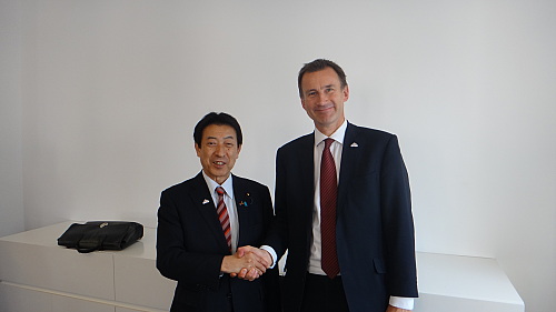 日本に2年間暮らした経験がある、大の知日家である英国のハント保健大臣と活発に意見交換。特に、認知症・高齢化問題や、ハント大臣が来年3月にサミット会議を提唱している患者安全(patient safety)問題などで盛り上がる。少なくとも、サミット会議には、本年10月から施行されたわが国の「医療事故調査制度」の関係者を参加してもらいたい、との要請を受ける。