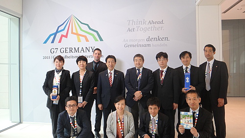 2日間にわたるG7 ベルリン保健大臣会合に臨んだ厚生労働省チーム、および来年のG7 保健大臣会合開催地である神戸市の市役所職員の皆さん、ドイツ保健省サポートスタッフと、シンボルパネルの前で、記念撮影。お疲れ様でした!